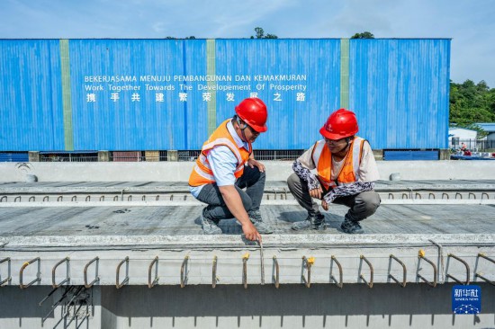 4月26日,在馬來西亞吉蘭丹州的馬東鐵項目一分部制梁場,技術(shù)主管鄧友志(右)和馬來西亞本地青年員工鄧德緯討論生產(chǎn)情況。五月初的馬來西亞烈日炎炎,中馬共建“一帶一路”的標志性項目——馬來西亞東海岸鐵路(馬東鐵)建設(shè)如火如荼。十支由中馬兩國員工組成的青年突擊隊活躍在全長600多公里的馬東鐵沿線建設(shè)現(xiàn)場,用汗水和擔(dān)當抒寫屬于這個時代的青春篇章。新華社記者 朱煒 攝