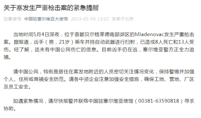 中新網(wǎng)5月5日電 據(jù)中國駐塞爾維亞大使館微信公眾號消息,當(dāng)?shù)貢r(shí)間5月4日深夜,位于首都貝爾格萊德南部郊區(qū)的Mladenovac發(fā)生嚴(yán)重槍擊案。據(jù)報(bào)道,兇手(男,21歲)乘車并持自動武器進(jìn)行掃射,已造成8人死亡和13人受傷。經(jīng)了解,迄未有中國公民傷亡的信息。目前兇手仍在逃,塞爾維亞警方正全力追捕。
