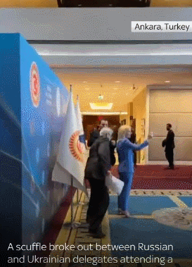 中新網(wǎng)5月5月電 綜合外媒報道,當?shù)貢r間4日,在土耳其安卡拉舉行的黑海經(jīng)濟合作組織議會大會(PABSEC)會議間隙,俄烏代表團成員因為一面烏克蘭國旗扭打在了一起。