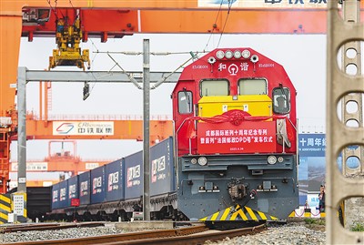 中歐班列是中法進出口貿(mào)易的重要橋梁。圖為4月26日,為紀念成都國際班列十周年而開行的“法國郵政DPD專列”在四川省成都市青白江區(qū)國際鐵路港首發(fā)。