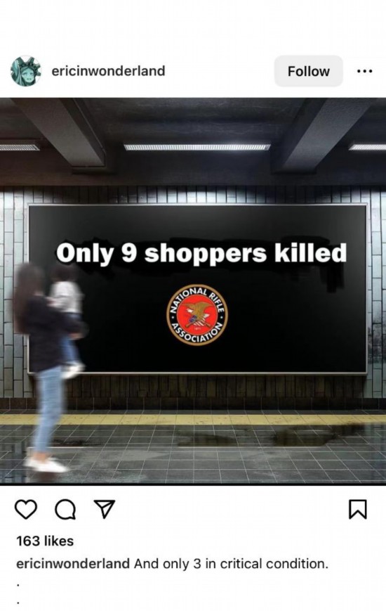 網(wǎng)友Ericinwonderland創(chuàng)作了一則帶有美國步槍協(xié)會標(biāo)識的“廣告”,上面寫道:“只死了9個?!?/p>
