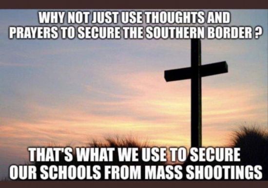 這幅漫畫則諷刺說:“為什么我們不只靠祈禱來阻止非法移民進(jìn)入美國?我們可是只靠祈禱來保護(hù)學(xué)校不發(fā)生大規(guī)模槍擊。”