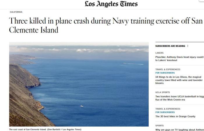 報道稱,其中一架載有三人的“利爾”噴氣式飛機(jī)從穆古角海軍航空站起飛,后與空中交通管制員失去聯(lián)系。美國海岸警衛(wèi)隊發(fā)言人李維·里德(Levi Read)隨后證實,這架飛機(jī)于10日上午7時55分左右墜入太平洋。另一架飛機(jī)安全著陸。
