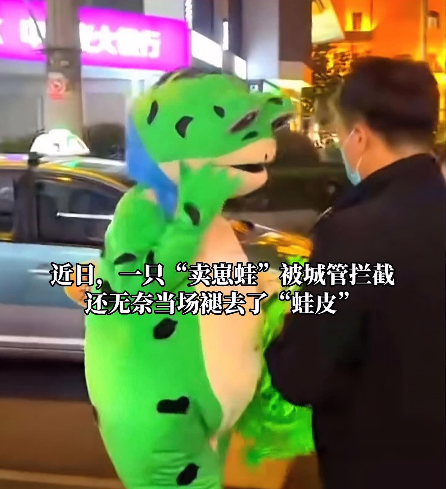 最近,“網(wǎng)紅賣(mài)崽青蛙上海落網(wǎng)”在網(wǎng)上引起熱議。在上海街頭,一只“賣(mài)崽青蛙”被城管攔截,還無(wú)奈當(dāng)場(chǎng)褪去了“蛙皮”。