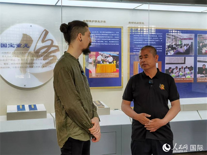 人民網(wǎng)意大利籍記者采訪云居寺文物管理處黨支部副書記、副主任李曙平(右一)。人民網(wǎng) 魯揚攝