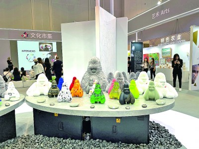 在中東歐展區(qū)的文化市集上,中國(guó)與中東歐國(guó)家的當(dāng)代藝術(shù)品同臺(tái)展出。其中,最吸引參觀者目光的,當(dāng)屬展臺(tái)正中擺放的一系列形態(tài)各異的中國(guó)藝術(shù)家原創(chuàng)IP形象“大衛(wèi)猿”雕塑或毛絨玩具。創(chuàng)作者袁澤銘介紹,本次展出的“大衛(wèi)猩球”項(xiàng)目邀請(qǐng)包括中國(guó)以及波黑、匈牙利、羅馬尼亞等中東歐國(guó)家在內(nèi)的全球藝術(shù)家為“大衛(wèi)猿”添加各自獨(dú)特的涂裝,體現(xiàn)了不同國(guó)家藝術(shù)家之間的文化交流以及藝術(shù)可能性的碰撞。