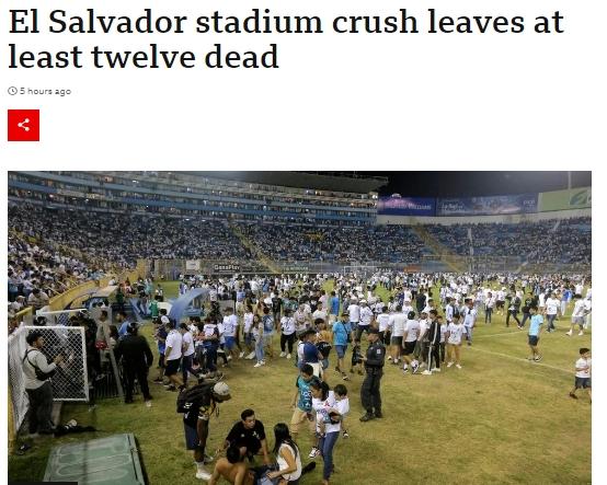 據(jù)英國廣播公司(BBC)報道,當(dāng)晚,圣薩爾瓦多庫斯卡特蘭球場舉行一場全國足球賽的四分之一決賽。不少因購買假票無法入場的球迷試圖強行擠入球場,其間發(fā)生人員踩踏,造成傷亡。多名傷者傷情較重。