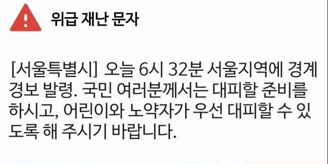 “今天6時32分首爾地區(qū)發(fā)布警戒警報。請各位國民做好躲避準(zhǔn)備,讓兒童和老弱者優(yōu)先躲避。”當(dāng)天清晨,首爾市民收到這條危急災(zāi)害通知,手機同時響起警笛聲。