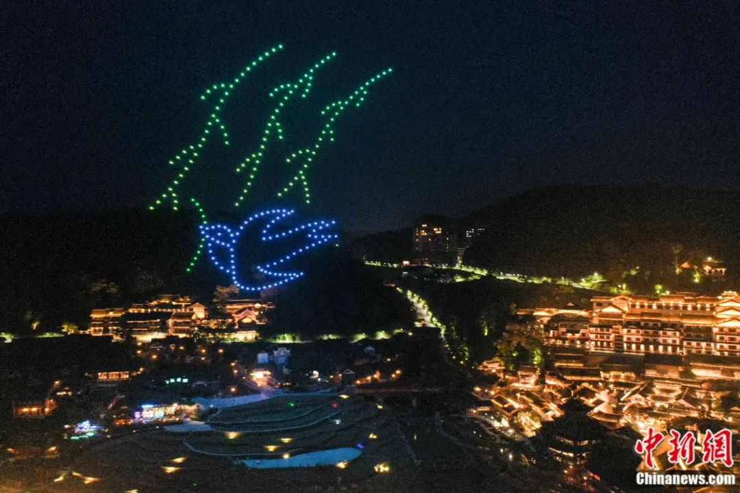 2022年6月,貴州省遵義市播州區(qū)烏江寨景區(qū)進(jìn)行無人機(jī)編隊表演。(無人機(jī)照片)瞿宏倫 攝