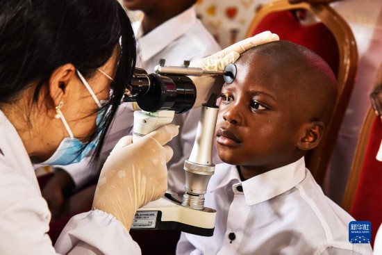 5月26日,在喀麥隆首都雅溫得,中國第22批援喀醫(yī)療隊(duì)的眼科大夫?yàn)椤昂⒆訛橹亍惫聝褐行牡膬和瘷z查眼睛。新華社發(fā)(科普索攝)