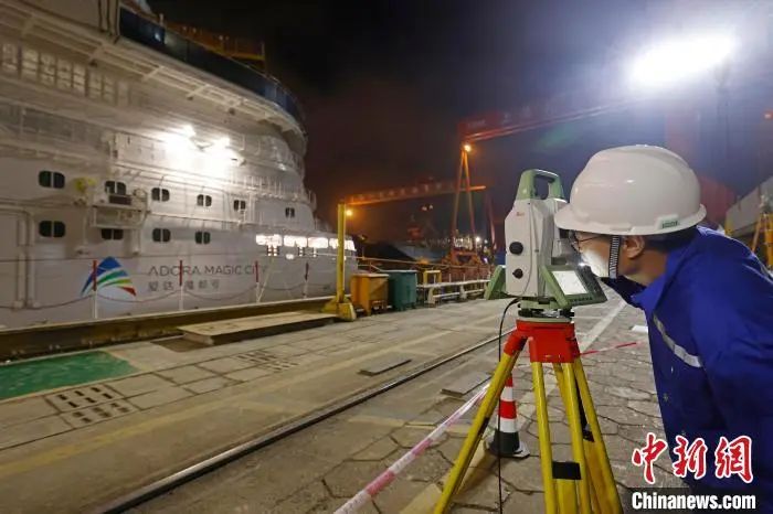 6月1日凌晨2時(shí),中國首艘國產(chǎn)大型郵輪“愛達(dá)·魔都號(hào)”開始注水起浮,工作人員對(duì)船體相關(guān)數(shù)據(jù)進(jìn)行檢測(cè)。殷立勤 攝