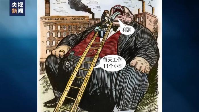 在這張漫畫中,一名瘦削的童工一天工作11個(gè)小時(shí),將利潤(rùn)送進(jìn)貪婪的雇主口中,將他們養(yǎng)得腦滿腸肥。