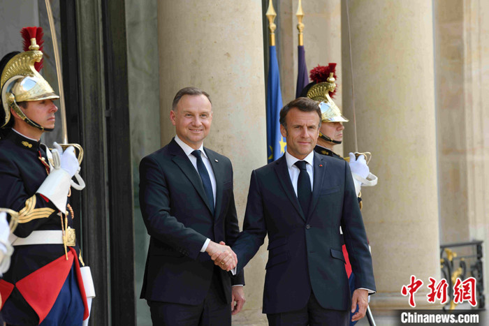 當(dāng)?shù)貢r間6月12日晚,法國總統(tǒng)馬克龍在巴黎愛麗舍宮會見波蘭總統(tǒng)杜達(dá)。杜達(dá)前來出席當(dāng)天舉行的法德波三國領(lǐng)導(dǎo)人會談。 中新社記者 李洋 攝