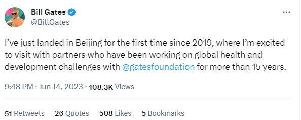 中新網(wǎng)6月14日電 北京時(shí)間14日,比爾及梅琳達(dá)·蓋茨基金會(huì)聯(lián)席主席兼理事、美國微軟公司聯(lián)合創(chuàng)始人比爾·蓋茨在社交媒體上發(fā)文稱已抵達(dá)北京。