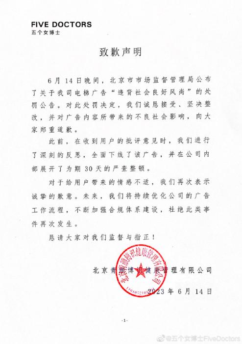 6月14日晚,“五個女博士”也在其微博發(fā)布致歉聲明稱,對此處罰決定,誠懇接受、堅(jiān)決整改,并對廣告內(nèi)容所帶來的不良社會影響,向大家鄭重道歉。