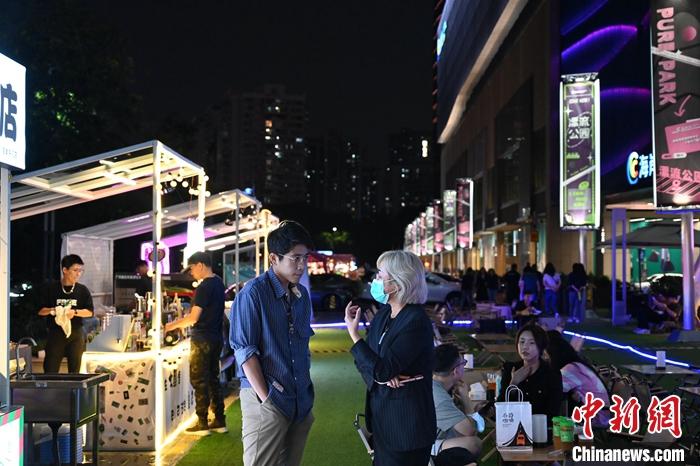夜幕下的深圳市南山區(qū)人潮涌動,一處集合了美食、潮流、游戲等元素的市集內,臺灣青年周伯彥正與幾位工作人員一起檢查場地布置和物料擺放,為市集營業(yè)做最后的準備。