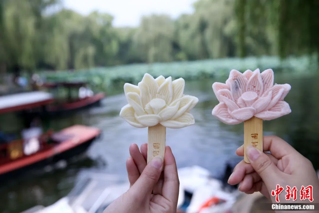 游人在圓明園遺址公園荷花區(qū)域拿著“荷花冰淇淋”拍照留念。陳曉根 攝