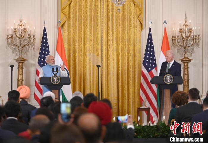 當(dāng)?shù)貢r(shí)間6月22日,印度總理莫迪對美進(jìn)行國事訪問。圖為美國總統(tǒng)拜登與莫迪在白宮出席聯(lián)合記者會(huì)。中新社記者 陳孟統(tǒng) 攝