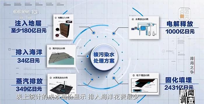 經(jīng)過兩年半的研討,日本技術(shù)委員會(huì)總結(jié)出了五種處理方案。方案一,注入地層,將污染水注入2500米深左右的地層結(jié)構(gòu)中。方案二,排入海洋,將核污染水稀釋或分離放射性物質(zhì)后排入大海。方案三,蒸汽排放,將核污染水進(jìn)行蒸發(fā),通過排氣管道排入大氣。方案四,電解釋放,將核污染水進(jìn)行電解反應(yīng)將生成的氫氣排入大氣。方案五,固化填埋,把核污染水和水泥等材料混合成固態(tài)后埋入地底。表上統(tǒng)計(jì)的成本造價(jià)顯示,排入海洋花費(fèi)最少。