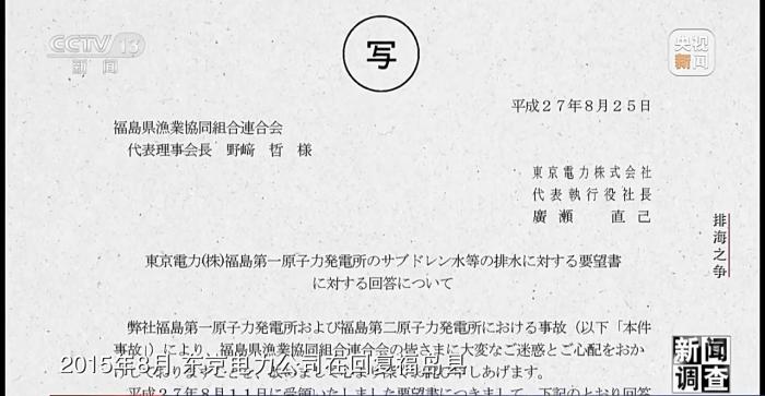 2015年8月,東京電力公司在回復(fù)福島縣漁業(yè)協(xié)作組合聯(lián)合會(huì)的請?jiān)笗鴷r(shí)做出書面承諾,在得到包括漁業(yè)從業(yè)者在內(nèi)的相關(guān)人員理解之前,不會(huì)對核污染水進(jìn)行任何處理。