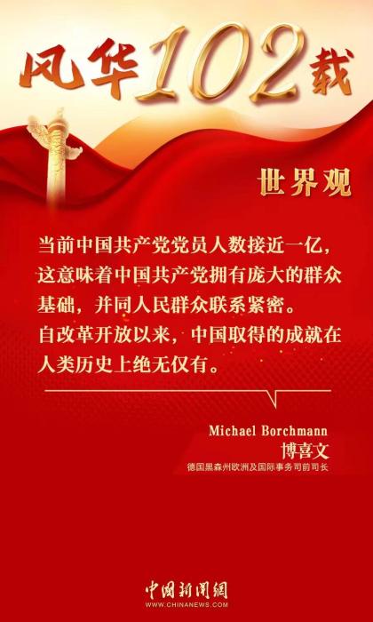 中新網(wǎng)7月5日電 (陳天浩)2023年是中國(guó)共產(chǎn)黨建黨102周年。近日,德國(guó)黑森州歐洲及國(guó)際事務(wù)司前司長(zhǎng)博喜文(Michael Borchmann)在接受中國(guó)新聞網(wǎng)專訪時(shí)表示,中國(guó)共產(chǎn)黨的成功離不開(kāi)同人民群眾的緊密聯(lián)系。