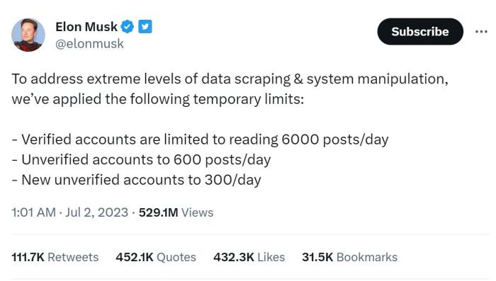 收購(gòu)近一年,馬斯克對(duì)于推特的改革仍在進(jìn)行中。他最新宣布要限制用戶每日的推文瀏覽量,以避免使用人工智能模型的公司對(duì)推特進(jìn)行“數(shù)據(jù)抓取和系統(tǒng)操縱”。