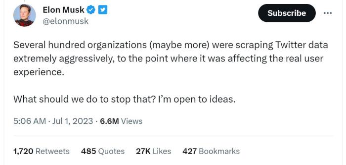 他還發(fā)布推文稱,數(shù)百個(gè)甚至更多的組織正在“極其積極地”抓取推特?cái)?shù)據(jù),“這影響了真正的用戶體驗(yàn)”,但馬斯克尚未說(shuō)明限制會(huì)持續(xù)多久,也并未表示在什么條件下將取消限制。
