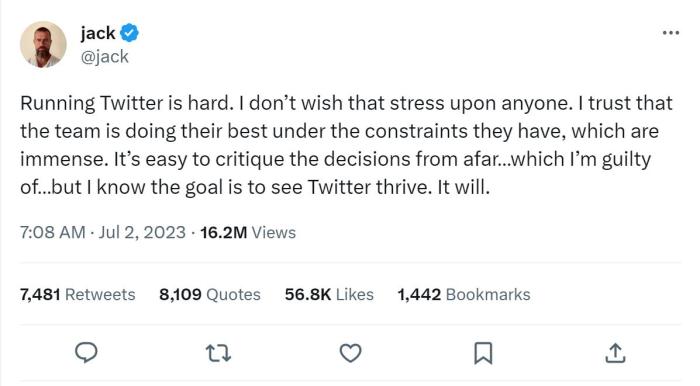 推特聯(lián)合創(chuàng)始人、前首席執(zhí)行官杰克·多爾西隨后發(fā)表了對(duì)此事的看法,他表示,“運(yùn)營(yíng)推特是很困難的。我不希望任何人受到這種壓力。我相信這個(gè)團(tuán)隊(duì)在巨大的限制條件下,正在盡最大努力。從遠(yuǎn)處批評(píng)這些決定是很容易的……我也對(duì)此感到歉疚……但我知道他們的目標(biāo)是要看到推特的繁榮。它會(huì)的?!?/p>