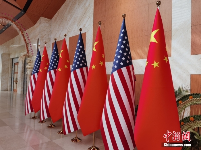 2022年11月,中美兩國元首在印尼巴厘島舉行會晤。圖為會場外擺放的中美兩國國旗。 郭金超 攝
