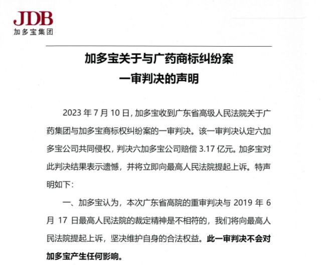7月10日,加多寶發(fā)布《加多寶關(guān)于與廣藥商標(biāo)糾紛案一審判決的聲明》,稱當(dāng)天收到廣東省高級人民法院關(guān)于廣藥集團與加多寶商標(biāo)權(quán)糾紛案的一審判決。該一審判決認定六加多寶公司共同侵權(quán),判決六加多寶公司賠償3.17億元。