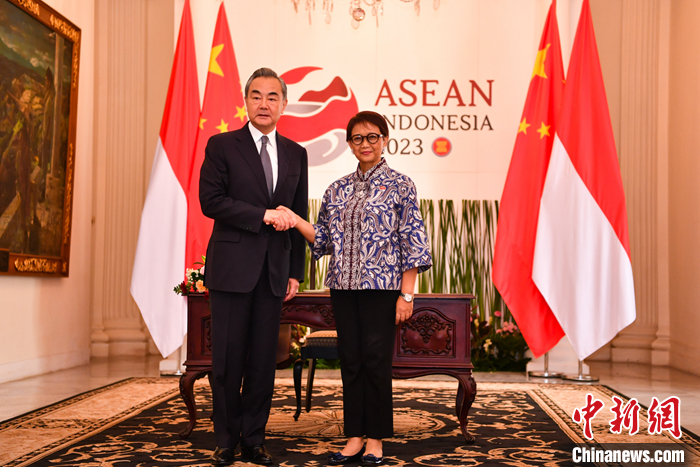 當(dāng)?shù)貢r(shí)間7月12日,中央外辦主任王毅在雅加達(dá)會(huì)見(jiàn)印尼外長(zhǎng)蕾特諾。 中新社發(fā) 徐欽 攝