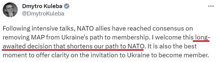 烏克蘭外長庫列巴說,這將“縮短烏克蘭加入北約的進程”,是烏方“期待已久的決定”。