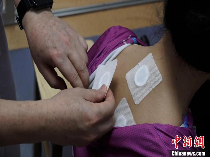 圖為醫(yī)生正在為民眾貼“三伏貼”?!√莆登纭z