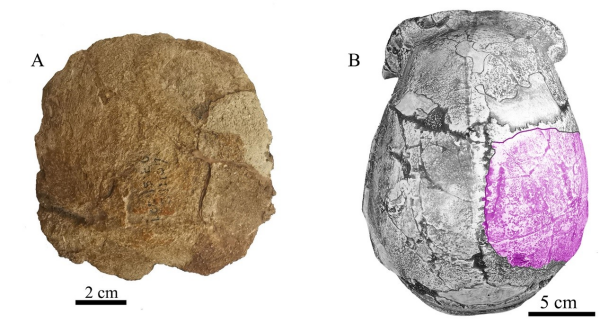 周口店第15號(hào)地點(diǎn)發(fā)現(xiàn)的人類頂骨化石。左側(cè):頂骨化石外側(cè)面觀;右側(cè):周口店直立人頭蓋骨模型頂面觀,示頂骨化石位置。圖片來源:中國科學(xué)院官網(wǎng)