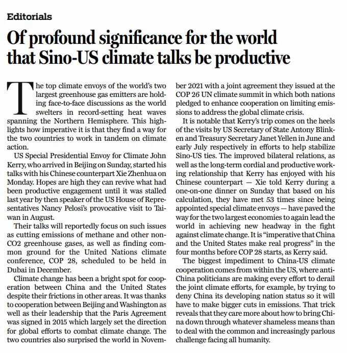 在舉世關(guān)注中,世界最大的兩個(gè)經(jīng)濟(jì)體的氣候特使舉行了面對面會談。當(dāng)前,北半球正在經(jīng)歷創(chuàng)紀(jì)錄的熱浪,凸顯了中美在氣候問題上攜手合作多么重要。
