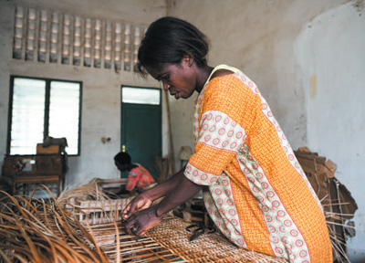 6月21日,在位于布隆迪經(jīng)濟(jì)首都布瓊布拉的卡蒙蓋手工業(yè)培訓(xùn)中心,學(xué)員在生產(chǎn)車(chē)間制作藤編產(chǎn)品。