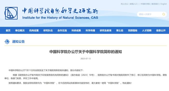 據(jù)中國科學(xué)院自然科學(xué)史研究所網(wǎng)站發(fā)布的消息,中國科學(xué)院辦公廳7月11日發(fā)布了關(guān)于中國科學(xué)院簡稱的相關(guān)通知,部分內(nèi)容如下: