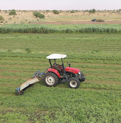 在中國援毛里塔尼亞畜牧業(yè)技術(shù)示范中心,工作人員操作機械收割紫花苜蓿。