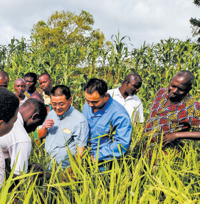 中國中化控股有限責(zé)任公司旗下荃銀高科的水稻專家在多哥示范田現(xiàn)場,為當(dāng)?shù)剞r(nóng)民講解水稻抽穗揚花期的關(guān)鍵技術(shù)和田間管理要點。
