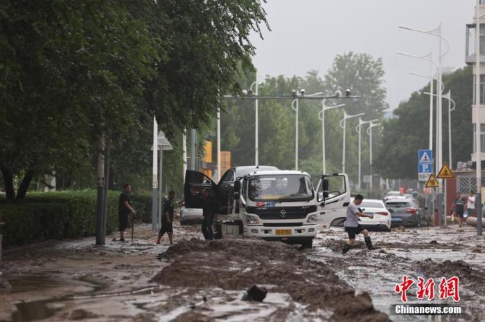 8月1日,北京市門頭溝區(qū)橋東街,救援車輛拉走受損汽車。 中新社記者 盛佳鵬 攝