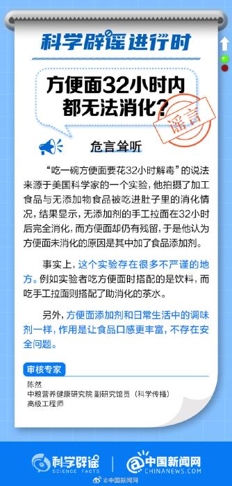中新網(wǎng)8月1日電 “吃一碗方便面要花32小時(shí)解毒”的說法來源于美國(guó)科學(xué)家的一個(gè)實(shí)驗(yàn),但這個(gè)實(shí)驗(yàn)存在很多不嚴(yán)謹(jǐn)?shù)牡胤?。方便面添加劑和日常生活中的調(diào)味劑一樣,作用是讓食品口感更豐富,不存在安全問題。(來源:@科學(xué)辟謠 @中國(guó)新聞網(wǎng) )
