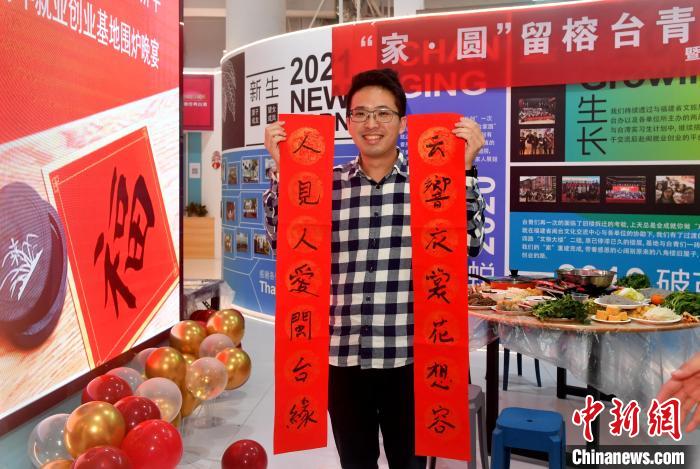 圖為魏辰運(yùn)參加留榕臺(tái)青圍爐守歲話新年活動(dòng)并展示自己寫(xiě)的春聯(lián)。呂明 攝