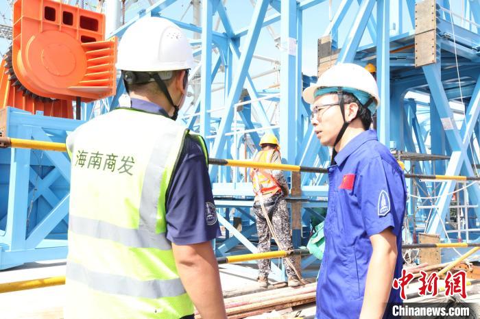 圖為首俊明在海南商業(yè)航天發(fā)射場1號工位向工人了解項(xiàng)目建設(shè)進(jìn)展。符宇群攝