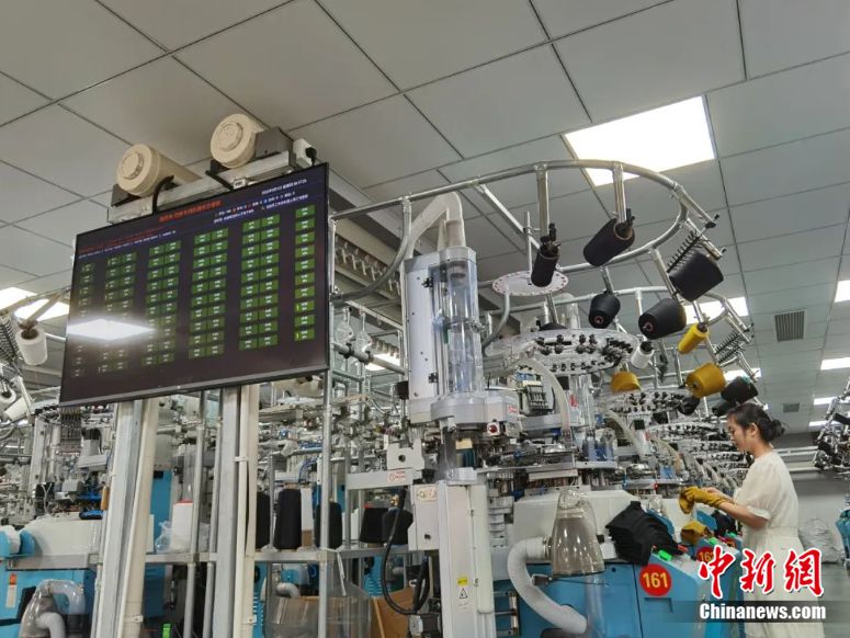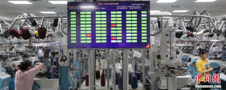 以縫頭為例,在一體化襪機之前,傳統(tǒng)的手工縫頭需要人工操作,效率很低,更新為襪機后,成本降低了至少一半。而智能系統(tǒng)端,機器的效率則被更加量化地體現(xiàn)在大屏幕上,一目了然,哪臺襪機出現(xiàn)問題,車間數(shù)據(jù)顯示屏就能看到,避免生產出次品襪子造成浪費。