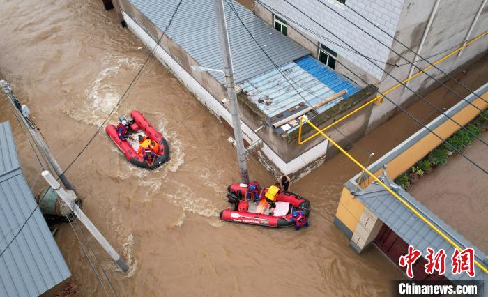 8月3日,藍(lán)天救援隊(duì)隊(duì)員在河北省涿州市刁窩鎮(zhèn)東馮村轉(zhuǎn)移村民。(無人機(jī)照片)中新社記者 翟羽佳 攝