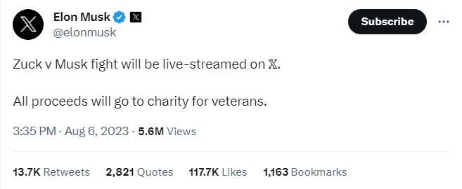 當(dāng)?shù)貢r(shí)間6日,馬斯克在“X”平臺(tái)上發(fā)文稱,要將兩人約架過程在“X”平臺(tái)直播,并把相關(guān)收益全部捐贈(zèng)給服務(wù)退伍老兵的慈善機(jī)構(gòu),同時(shí)表示自己正在為決斗“夜以繼日”地訓(xùn)練。