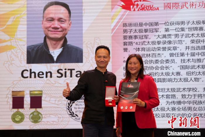 8月7日,加拿大聯(lián)邦眾議員葉嘉麗(右)向來自中國的太極名家陳思坦頒授國際武術(shù)功夫名人堂勛章?!≈行律缬浾?余瑞冬 攝