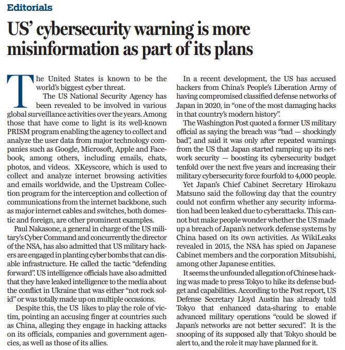 盡管如此,美國(guó)卻總是裝出一副受害者的樣子,指責(zé)中國(guó)等國(guó)對(duì)美國(guó)及其盟友的官員、企業(yè)和政府機(jī)構(gòu)發(fā)動(dòng)黑客攻擊。最近,美國(guó)就指責(zé)中國(guó)黑客在2020年入侵了日本防衛(wèi)部門的機(jī)密網(wǎng)絡(luò),稱之為“日本現(xiàn)代史上最具破壞性的黑客攻擊之一”。然而,日本內(nèi)閣官房長(zhǎng)官松野博一表示,日本無(wú)法確認(rèn)是否有任何安全信息因網(wǎng)絡(luò)攻擊而泄露。這不禁讓人懷疑,美國(guó)是否根據(jù)自己的黑客活動(dòng),編造了中國(guó)破壞日本網(wǎng)絡(luò)防御系統(tǒng)的故事?維基解密在2015年就披露,美國(guó)國(guó)家安全局在秘密監(jiān)視日本內(nèi)閣成員和三菱公司,以及其他日本實(shí)體。