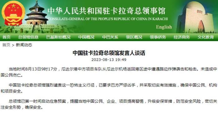 中國(guó)駐卡拉奇總領(lǐng)館強(qiáng)烈譴責(zé)這一恐怖主義行徑,已要求巴方嚴(yán)懲兇手,并采取切實(shí)有效措施,確保中國(guó)公民、機(jī)構(gòu)和項(xiàng)目安全。