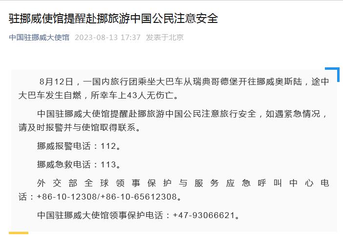 中新網(wǎng)8月13日電 據(jù)中國駐挪威大使館微信公眾號消息,8月12日,一國內(nèi)旅行團乘坐大巴車從瑞典哥德堡開往挪威奧斯陸,途中大巴車發(fā)生自燃,所幸車上43人無傷亡。